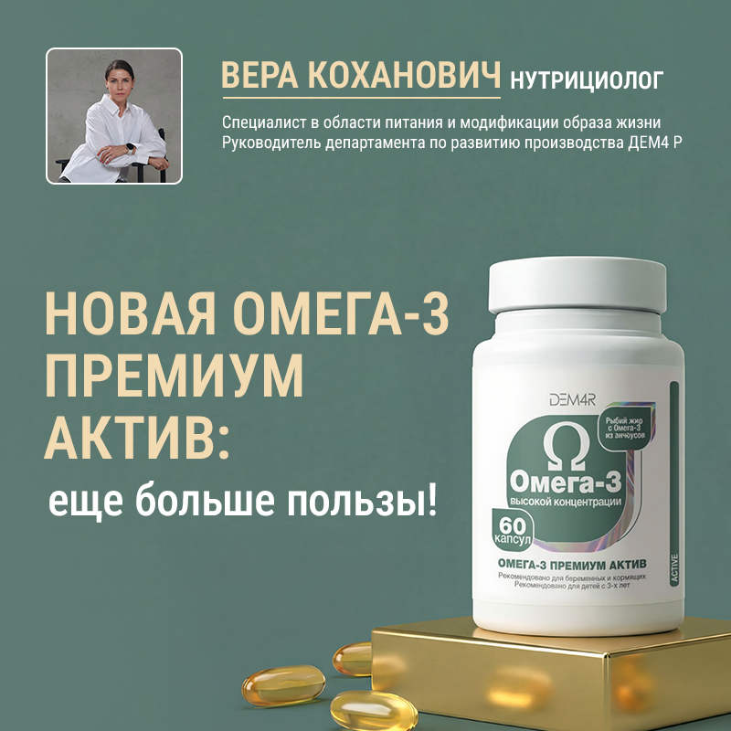 Вера Коханович, нутрициолог, Руководитель департамента по развитию производства ДЕМ4 Р, подготовила статью: Омега-3 Премиум Актив: новая формула, ещё больше пользы.