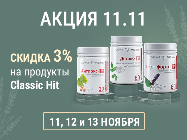 Специально для вас мы подготовили уникальное предложение: скидку 3% на серию продуктов линии Classic Hit DEM4 R всего три дня — 11, 12 и 13 ноября. Это ваш шанс приобрести лучшие средства для поддержки здоровья именно тогда, когда это особенно важно — осенью и зимой.