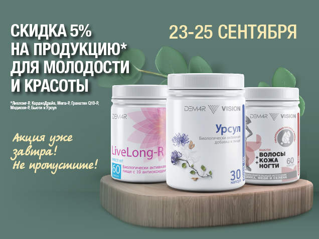 К этому празднику мы приготовили акцию на продукты для молодости и красоты. С 23 по 25 сентября компания ДЕМ4 Р предоставляет своим покупателям замечательную возможность: скидку 5% на Ливлонг-Р, КардиоДрайв-Р, Мега-Р, Гранатин Q10-Р, Медисоя-Р, Бьюти и Урсул. Все эти продукты созданы для тех, кто хочет сохранить энергию и жизненные силы на долгие годы.