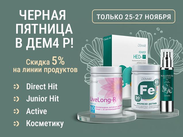 Готовьтесь к самому горячему событию сезона! Только с 25 по 27 ноября действует уникальная акция со скидкой 5% на все* продукты линий Direct Hit, Junior Hit, Active и потрясающую косметику DEM4 R**.