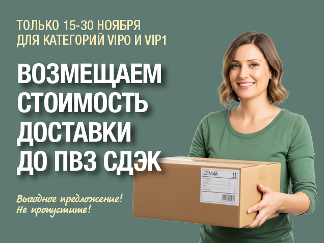 Если вы еще не являетесь нашим покупателем, предлагаем пройти регистрацию на сайте dem4r.com. После регистрации вы сразу получите статус ВИП0 и приятные цены со скидками. А с новой акцией вы сможете не только оформить заказ, но и получить стопроцентную компенсацию стоимости его доставки до пункта выдачи СДЭК.