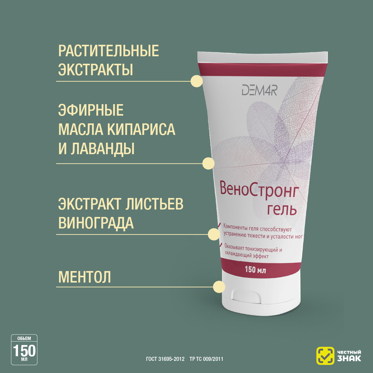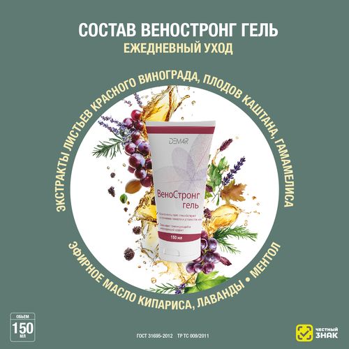 VenoStrong Gel предназначен для ухода за кожей ног. Входящие в состав растительные экстракты и эфирные масла комплексно воздействуют на кожу. Экстракт иглицы колючей способствует уменьшению отека и сокращению вен, ментол оказывает легкий охлаждающий эффект, экстракты гамамелиса и конского каштана благотворно влияют на сосуды ног, обладают антибактериальными и противовоспалительными свойствами. Исследования свойств активных компонентов этих растений указывают на то, что и их регулярное применение способствует укреплению сосудов, улучшению микроциркуляции крови. Эфирные масла кипариса и лаванды также способствуют продвижению крови и избавляют от застойных явлений. Экстракт листьев винограда – источник антиоксидантов, которые снижают поверхностные воспалительные процессы и улучшают общий тонус тканей. VenoStrong Gel легко впитывается и очень приятен в использовании.