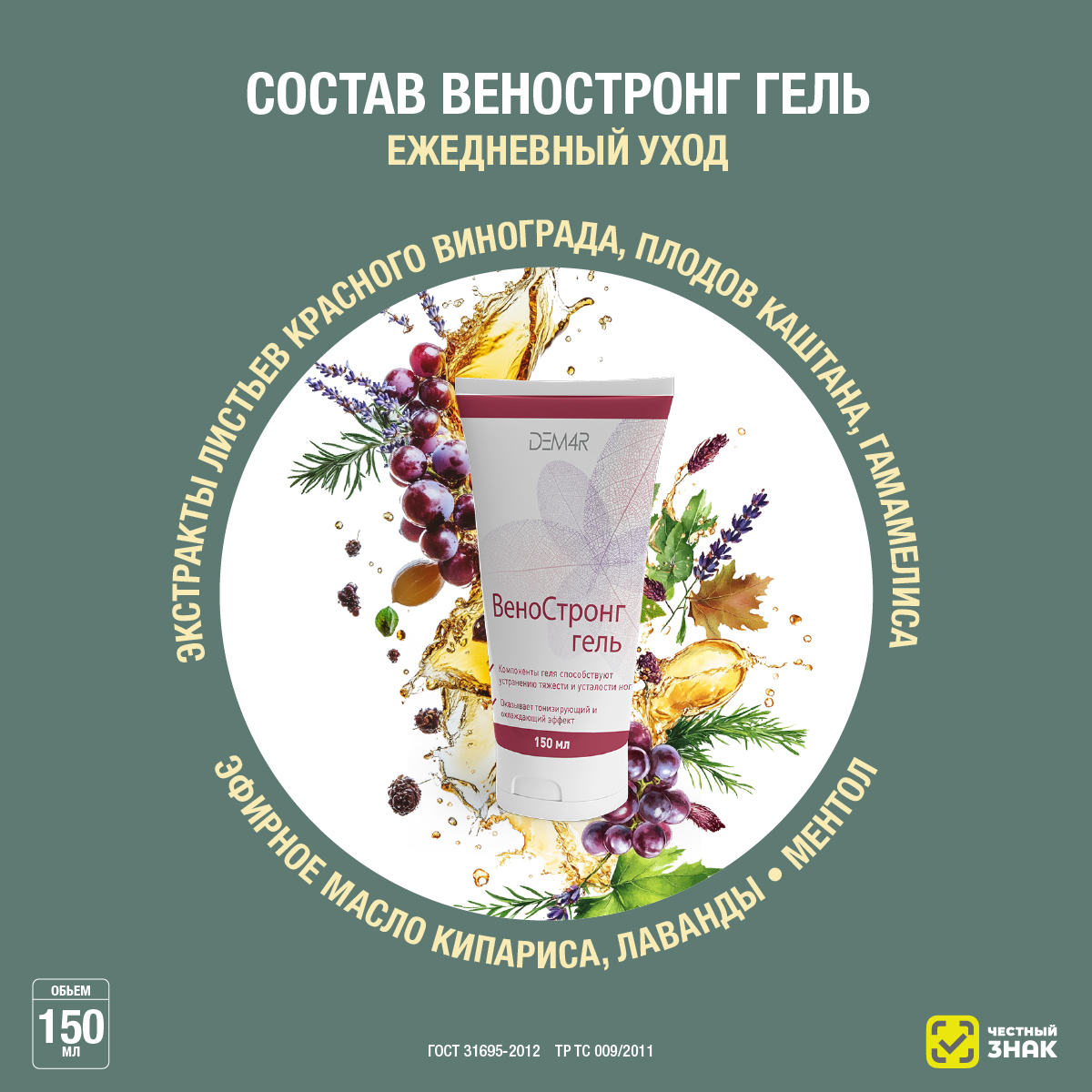 Состав: вода, водные экстракты листьев красного винограда, каштана конского плодов, г амамелиса, пропиленгликолевый экстракт иглицы, изопропиловый спирт, пропиленгликоль, ПЭГ-40 гидрогенизированное касторовое масло, троксерутин, феноксиэтанол, карбомер, ментол, триэтаноламин, этилгексилглицерин, масло эфирное кипариса, масло эфирное лаванды, лимонен, линалоол.
