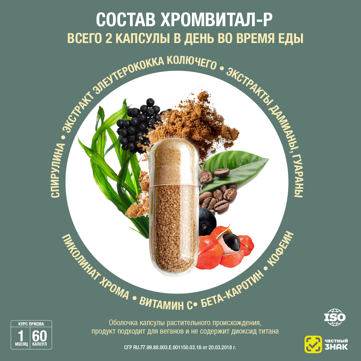Четыре растительных экстракта в составе Хромвитал-Р – элеутерококка, дамианы, гуараны и спирулины – природные источники силы и выносливости.