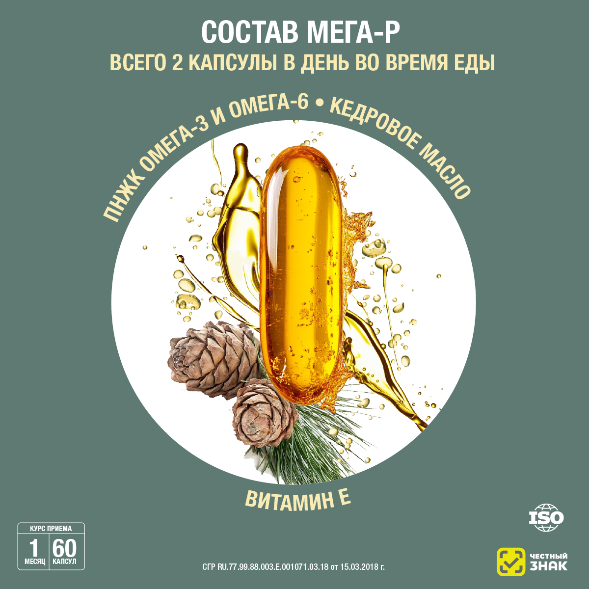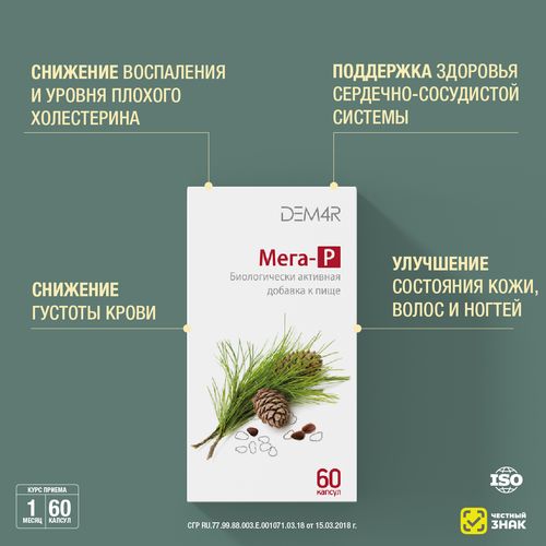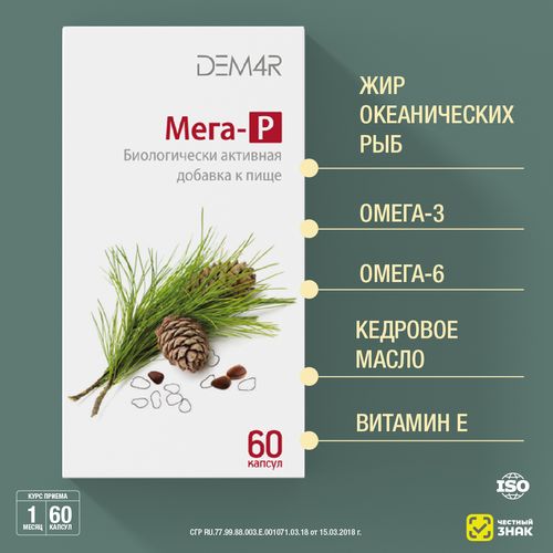 ПНЖК Омега-3: полиненасыщенные жиры (ПНЖК) Омега-3 входят в структуру клеток сердца, крови, мозга, кровеносных сосудов, зрительного аппарата, кожи. Они регулируют такие важные свойства клеточных мембран, как проницаемость, микровязкость, возбудимость. Именно от этих свойств зависят различные процессы жизнедеятельности организма: передача сигналов между клетками, активность работы мозга, состояние сетчатки глаз, молодость кожи. Мега-Р является источником самых ценных ПНЖК Омега-3 – эйкозапентаеновой, докозагексаеновой кислот.