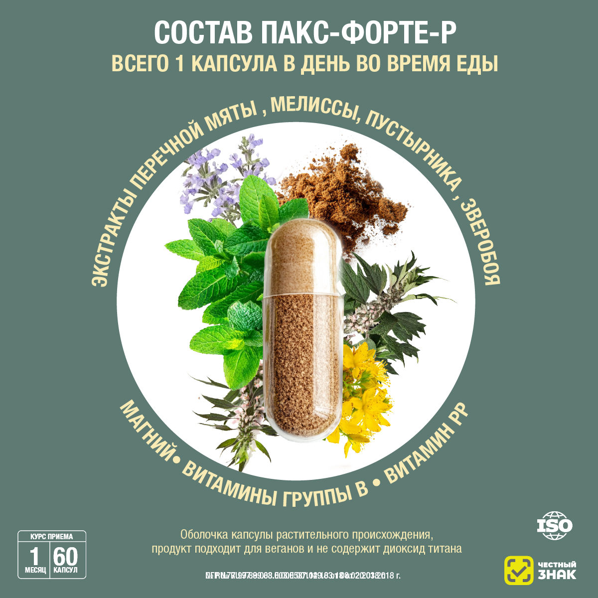 магния оксид, глицин, оболочка капсулы (гидроксипропилметилцеллюлоза, носитель), мята перечная экстракт сухой листьев, мелисса лекарственная экстракт сухой травы, пустырник сердечный экстракт сухой травы, зверобой продырявленный экстракт сухой травы, пассифлора воплощенная экстракт сухой травы, витамин РР (никотинамид), витамин В5 (кальция пантотенат), стеарат магния (или стеарат кальция) (антислеживающий агент), мальтодекстрин (носитель), витамин В6 (пиридоксина гидрохлорид), аэросил (антислеживающий агент), витамин В2 (рибофламин), витамин В1 (тиамина мононитрат), витамин В9 (фолиевая кислота), витамин Н (биотин), витамин В12 (цианокобаламин).