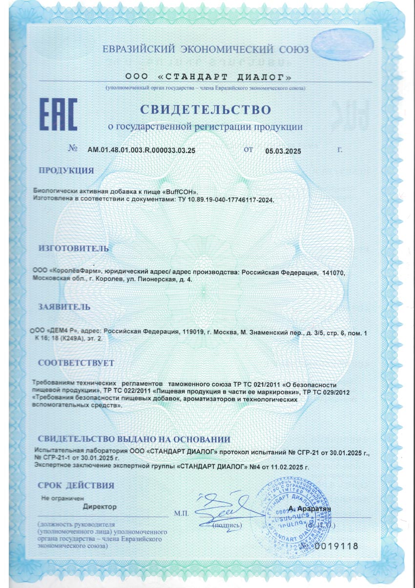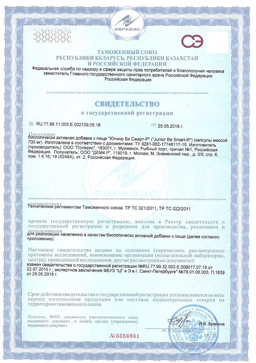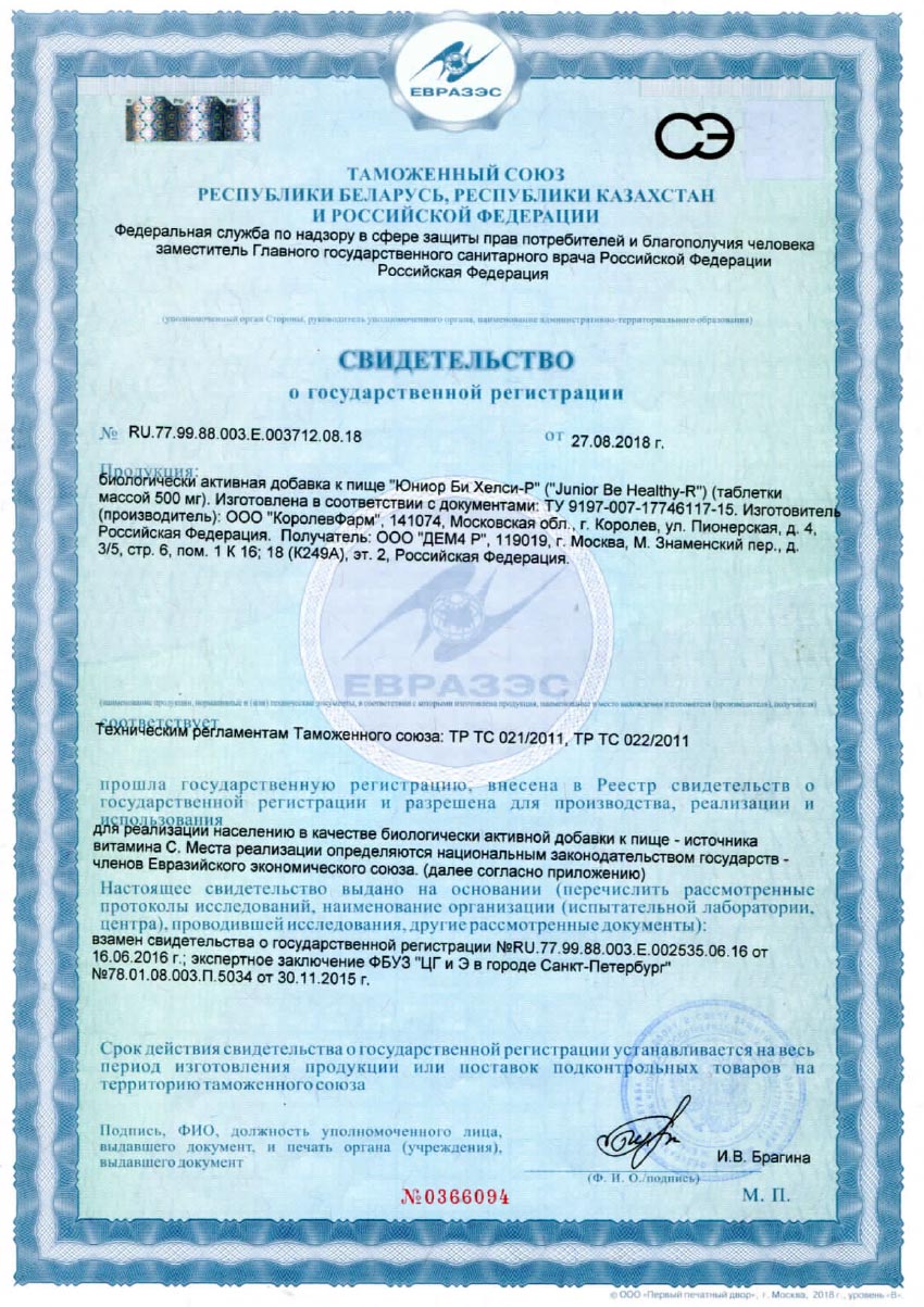 Свидетельство о государственной регистрации: № RU.77.99.88.003.Е.001151.03.18 от 20.03.2018 г.